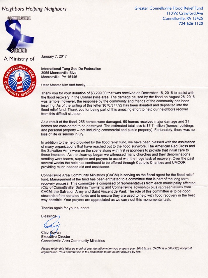 Master C. S. Kim, the head Instructors of the C. S. Kim Karate schools of Pittsburgh, and our C. S. Kim Karate family presented the Connellsville, PA flood victims with our donation.